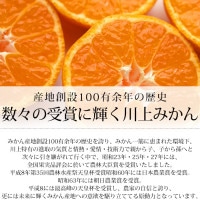 川上みかんはみかん栽培に最適な気象・風土・気質・歴史・技術の総合力によって糖度・酸度のバランスと、じょうのうが薄くとろける様な舌触りが特徴の「うまいみかん」として絶賛されています。